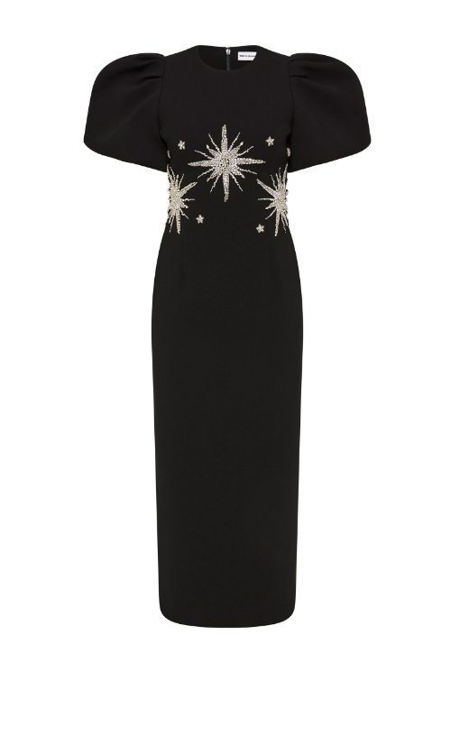 The Estella Midi Dress in black epitomises timeless elegance and glamour. It showcases voluminous short puff sleeves, perfectly complemented by a high scoop neckline and a fitted bodice adorned with glamorous beaded applique details. The pencil skirt creates a feminine...