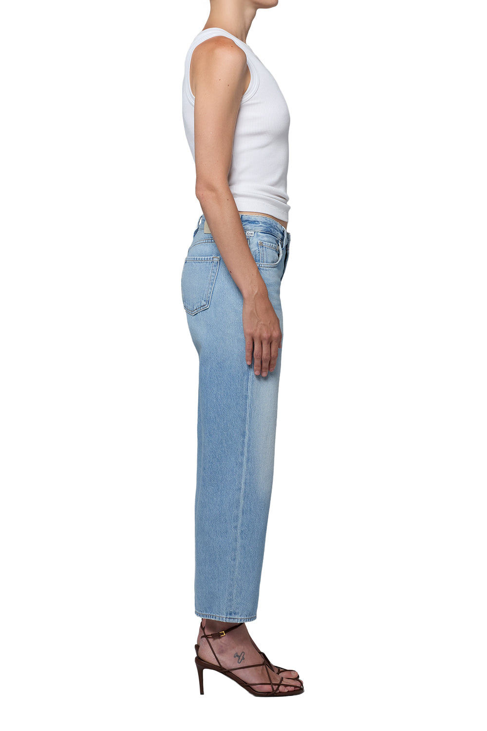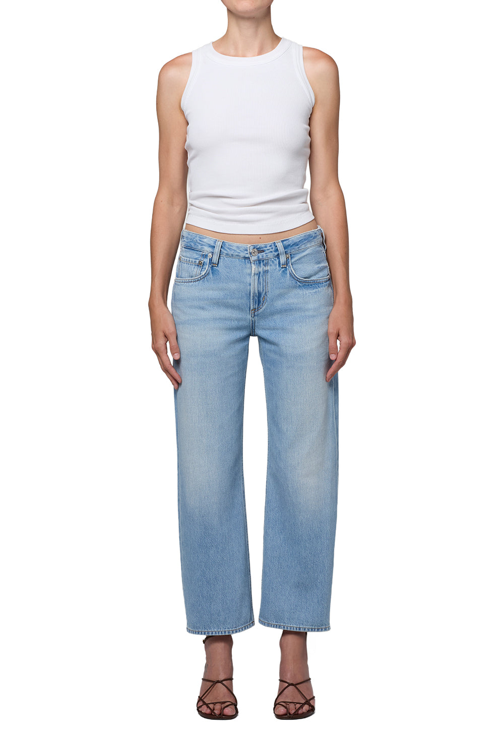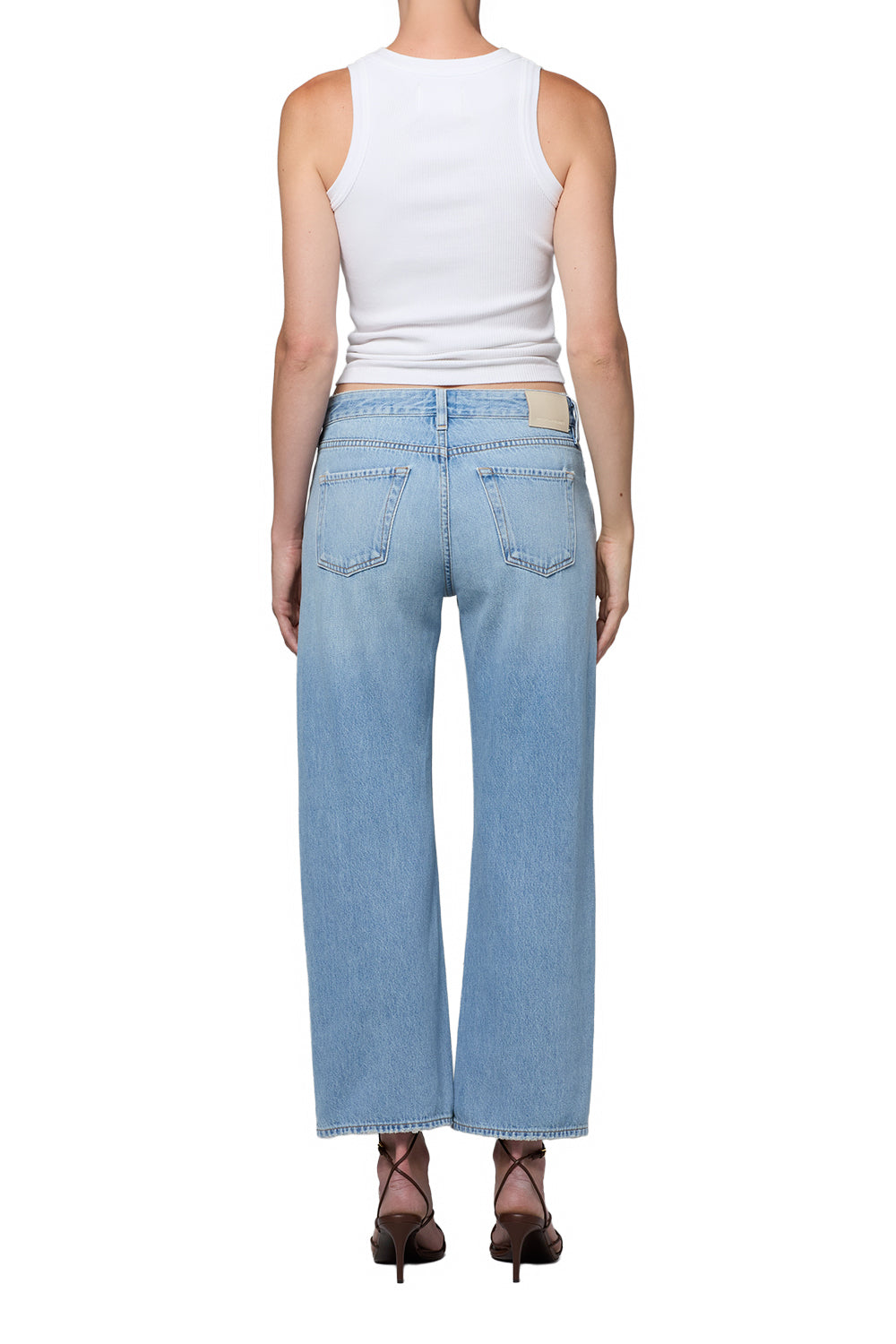 A modern nod to boyish vintage denim, the Faye sits low on the hip with a contoured inseam that enhances its slouchy, reimagined fit. Cut from light vintage indigo denim, this cropped silhouette is crafted in rigid, non-stretch fabric with a soft hand—offering authentic texture and all-day ease.