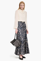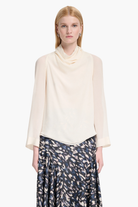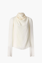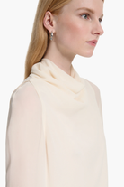 The Cara top is crafted in Italy with a buttoned high-neck and long bell sleeves, offering a refined, timeless drape.