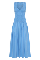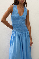 A vacation-inspired midi dress, designed from a signature 100% cotton yarn-dyed in a vibrant azul blue stripe. Sleeveless with a deep V-neckline, it is shirred through the bodice for a cinched silhouette, before flaring into a gathered A-line skirt. Lightweight with effortless appeal, it is the perfect vacation companion.