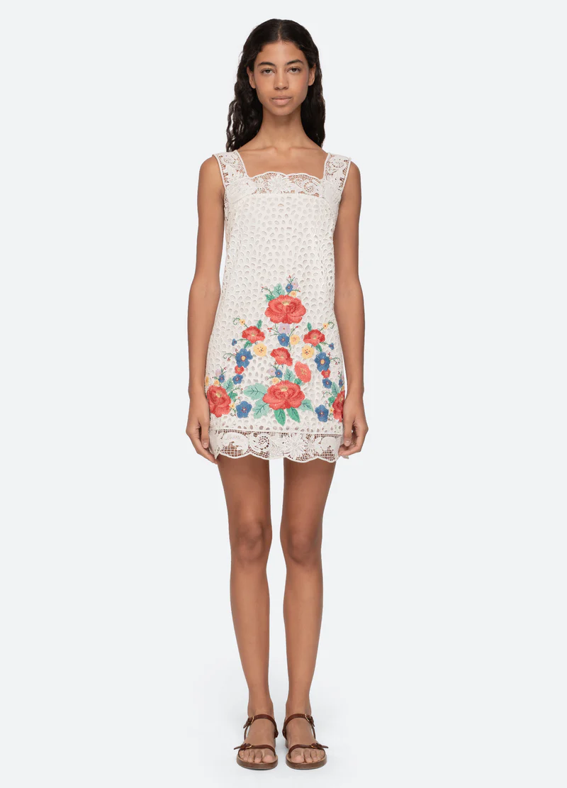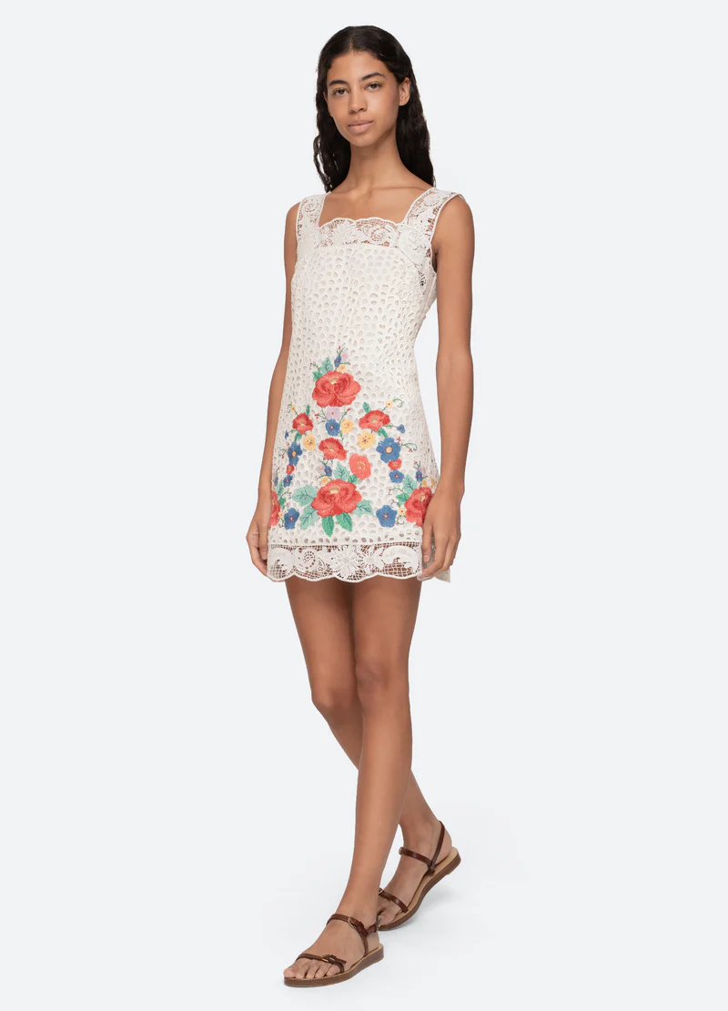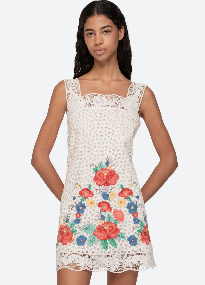 The Astrid embroidered mini dress is adorned with bold floral embroidery throughout and finished with an intricate lace trim. Its mini silhouette gives it a playful, casual charm perfect for everyday wear.
