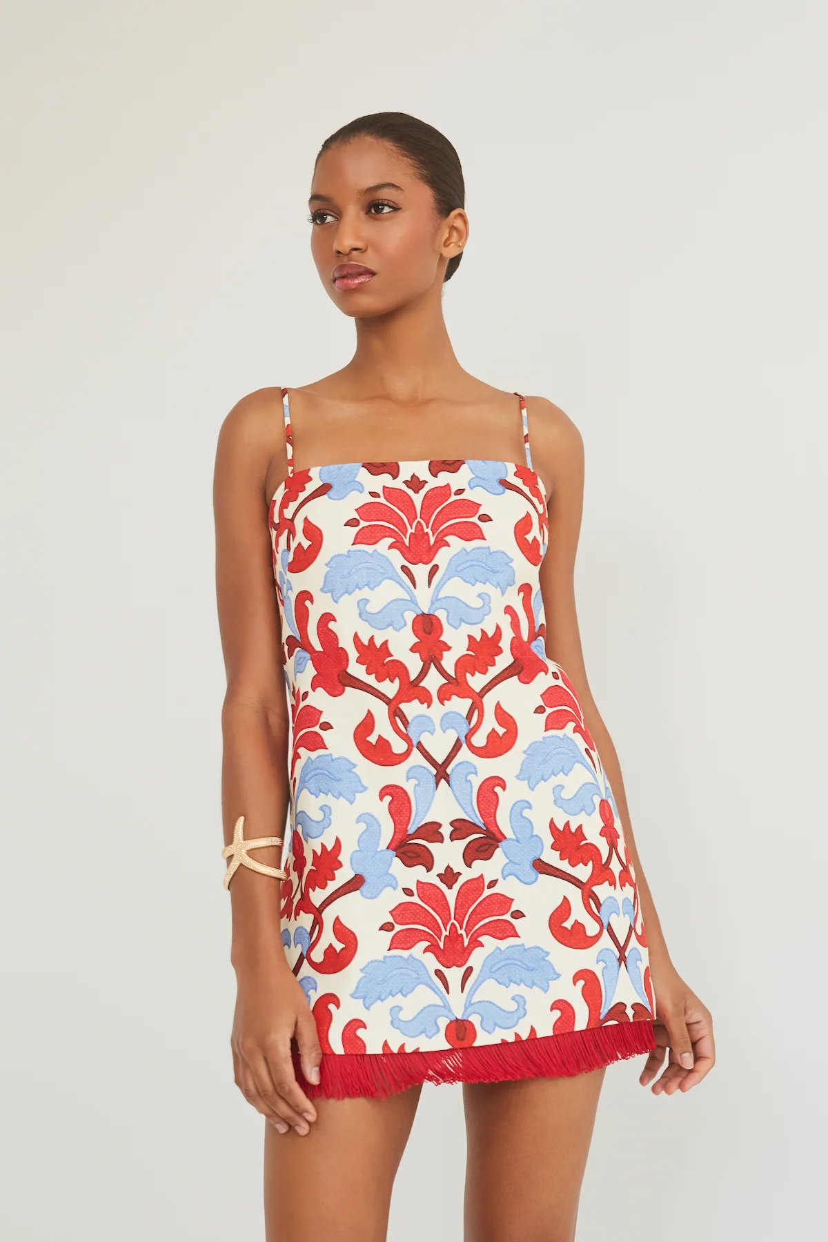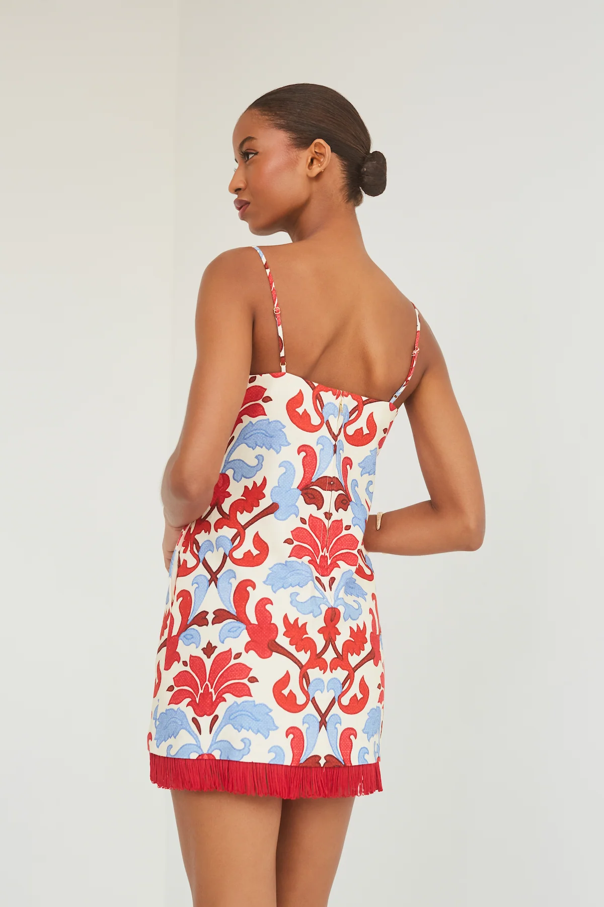 • Mini shift dress with spaghetti straps with DTM fringe adorned hem designed for a fit and flare look