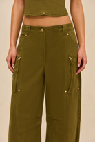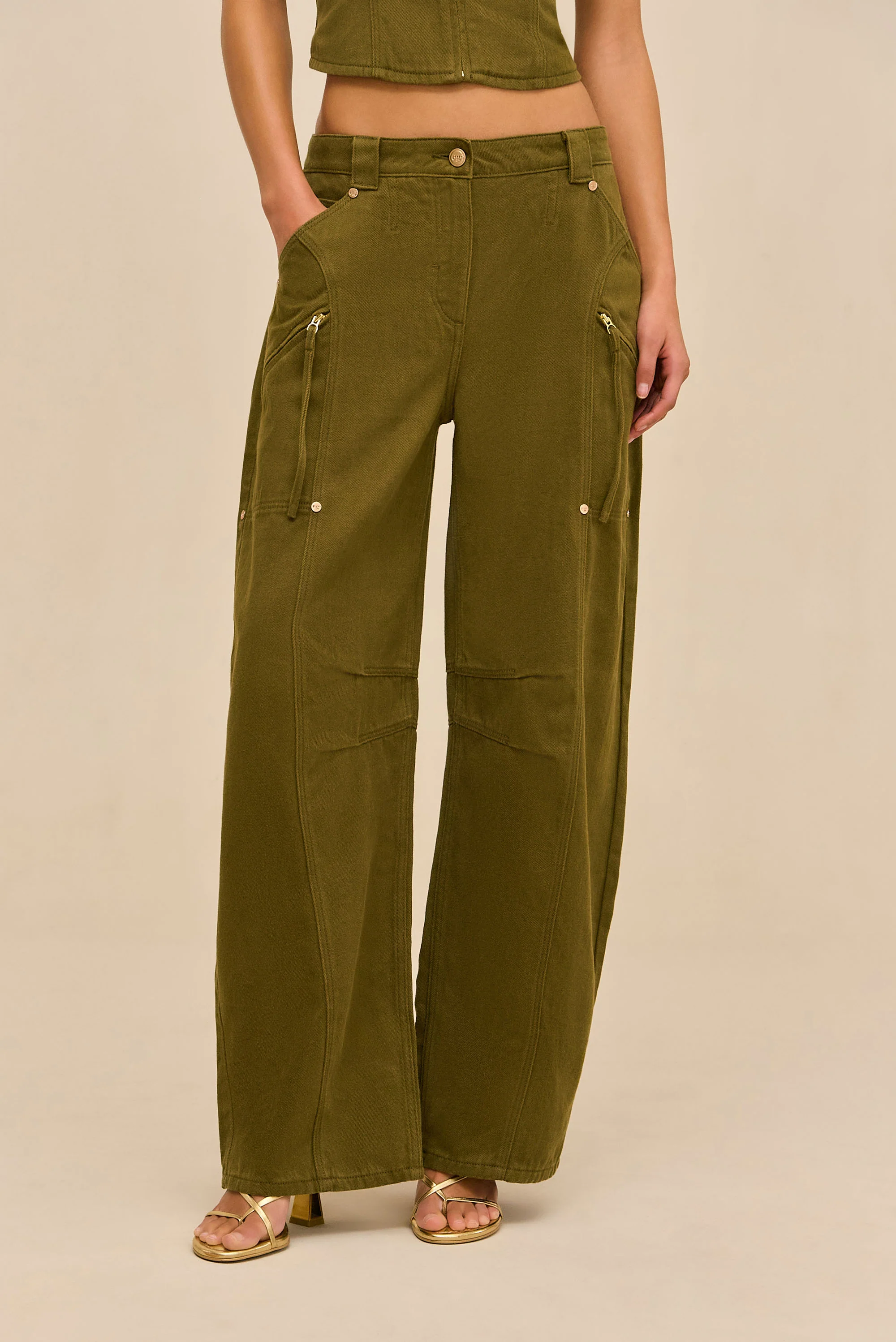 A high-waisted twill pant with utility-inspired seaming and a relaxed wide-leg silhouette crafted from a hemp–cotton blend.