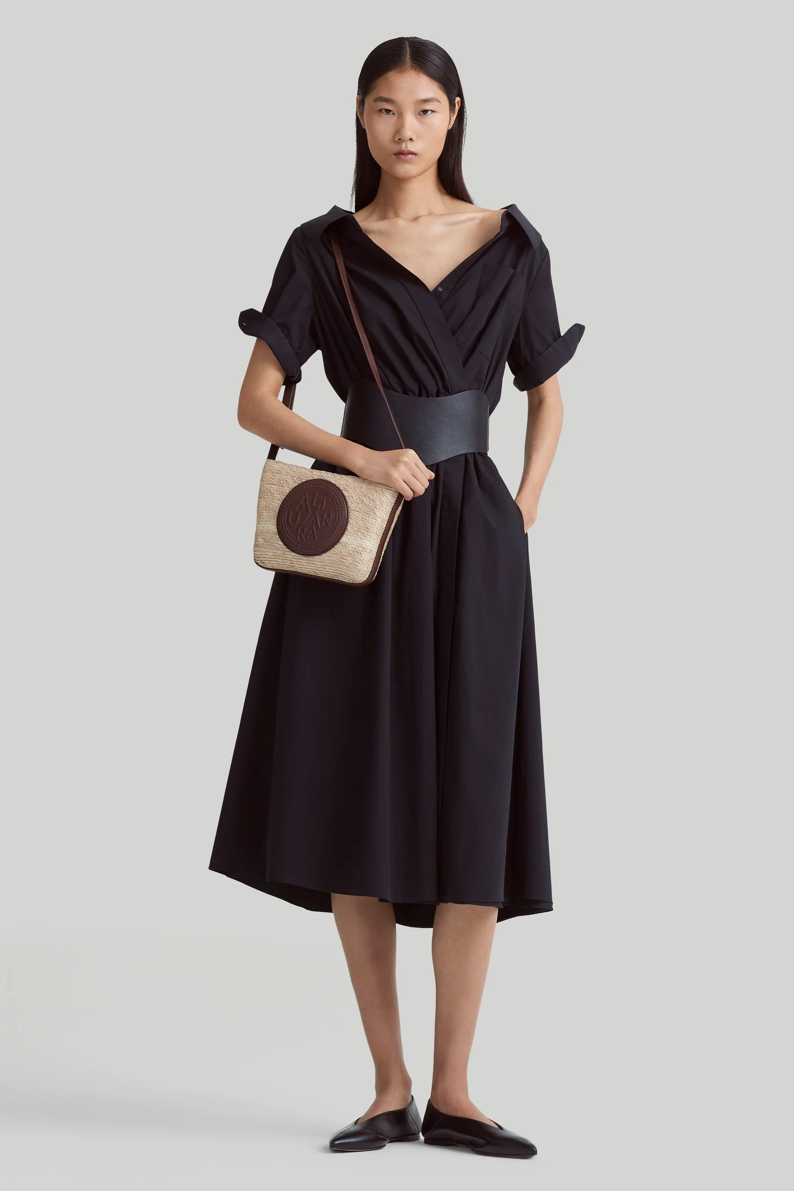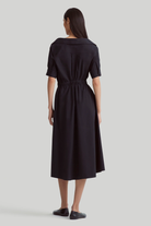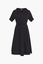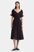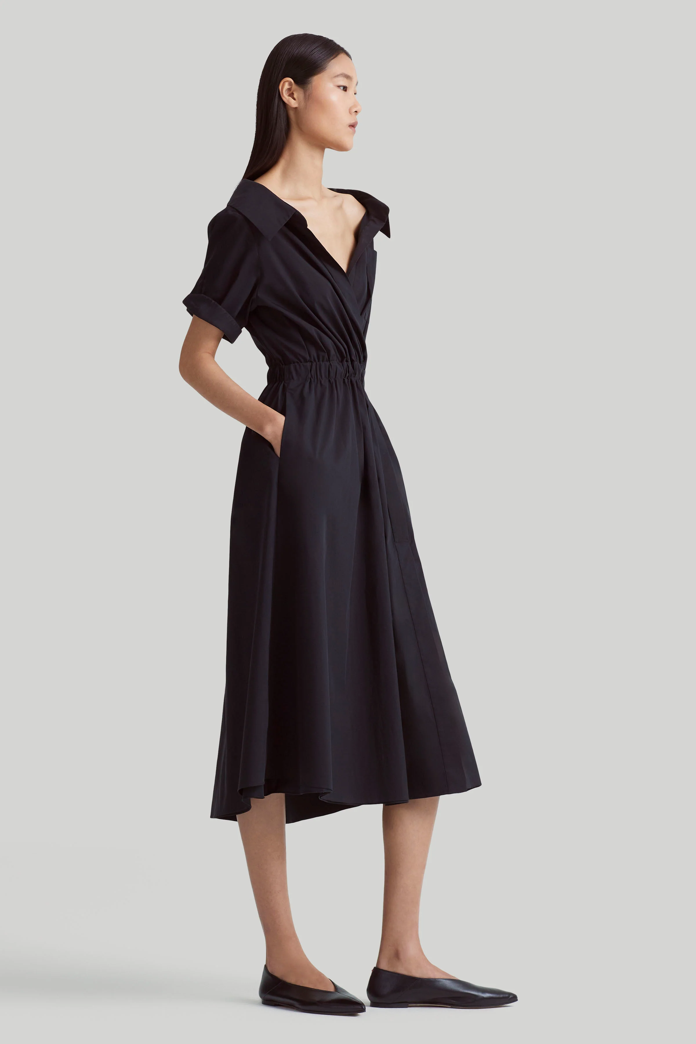 The Lydia dress is designed from airy cotton poplin in a relaxed midi silhouette with an elasticized waist. The frock has an open collared neckline and on-seam pockets that exude undone ease.