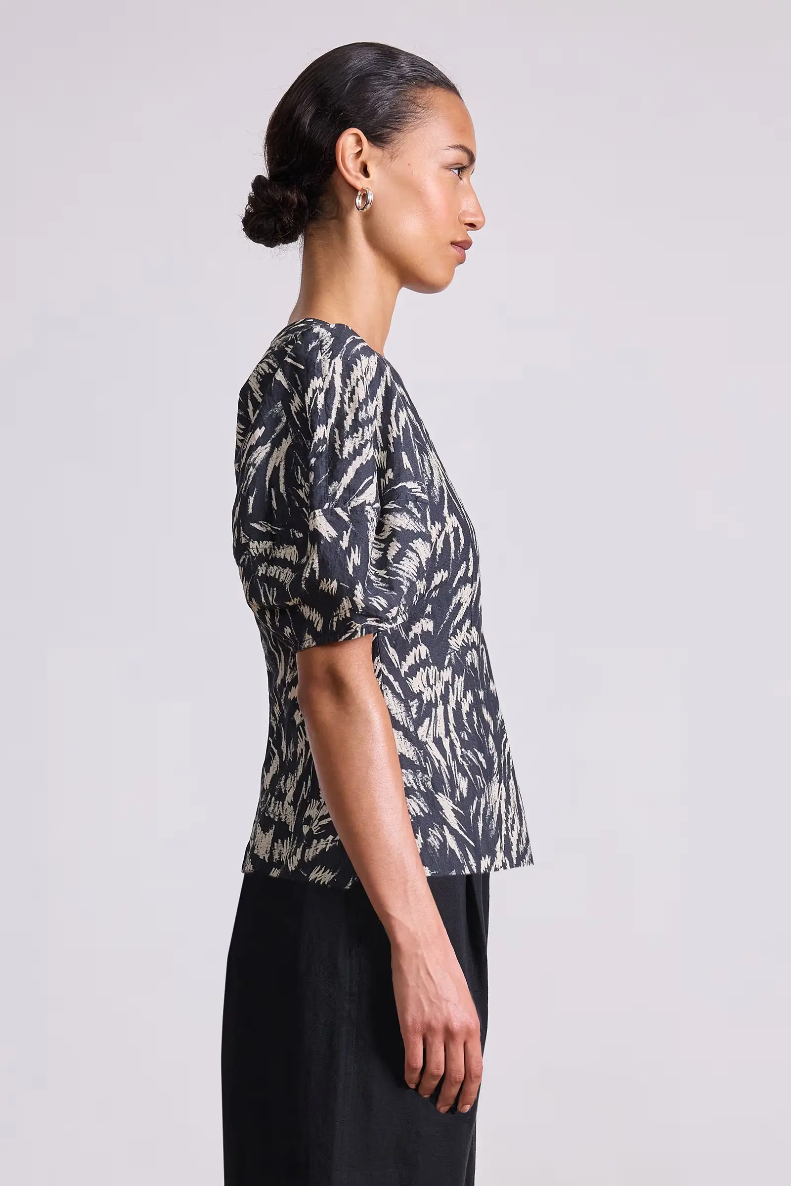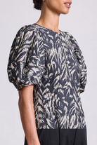 An easy silhouette complete with a flattering high neck and feminine puff sleeves.