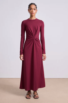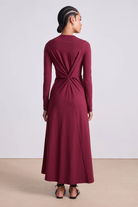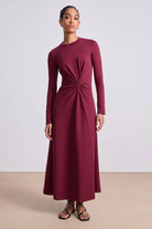 • Crew neckline, long sleeves, rib collar, twist details at front and back, midi length