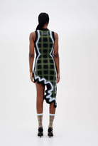 Plaided signature wavy asymmetric dress in sustainably sourced yarns. Side border details create a slimming optical illusion