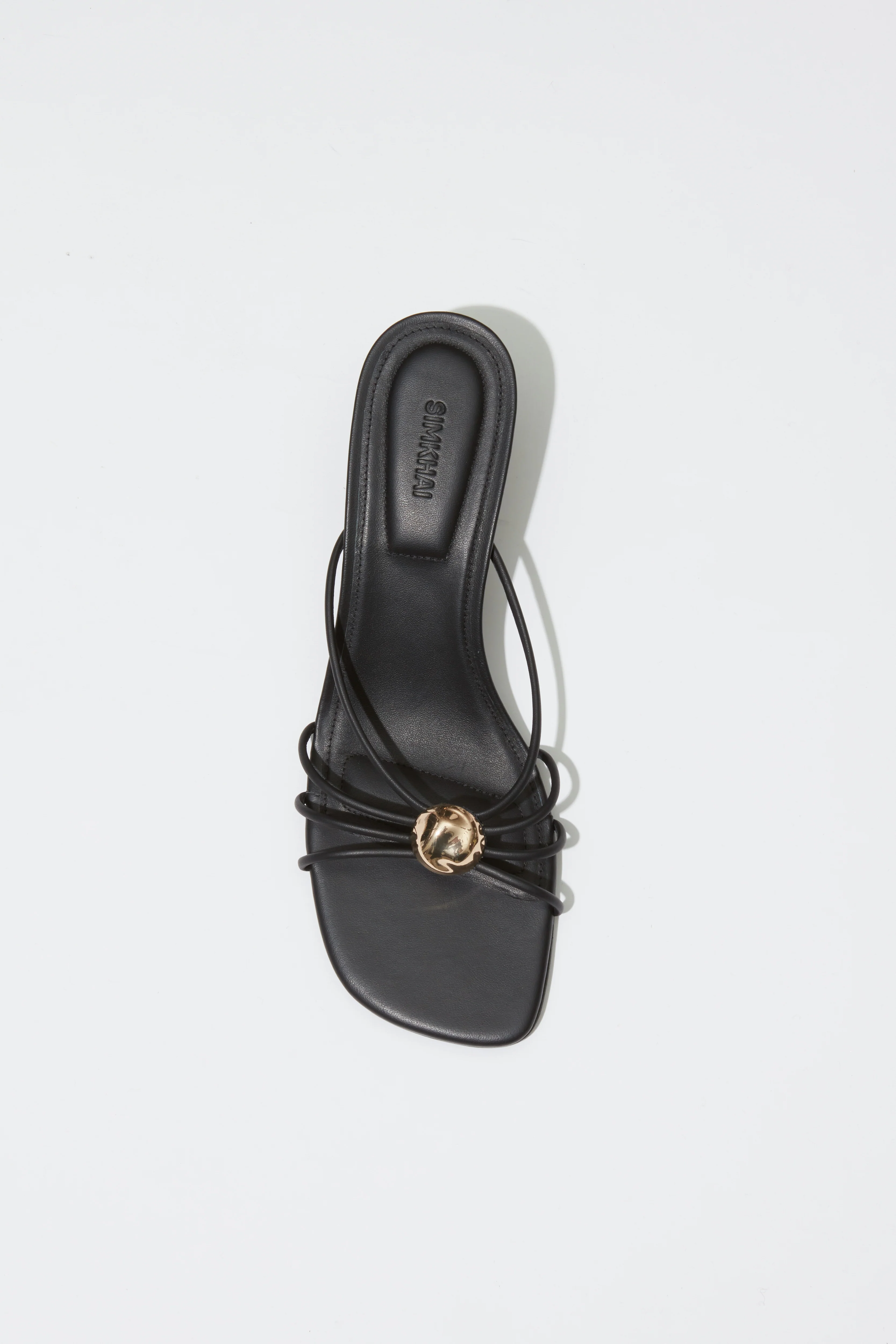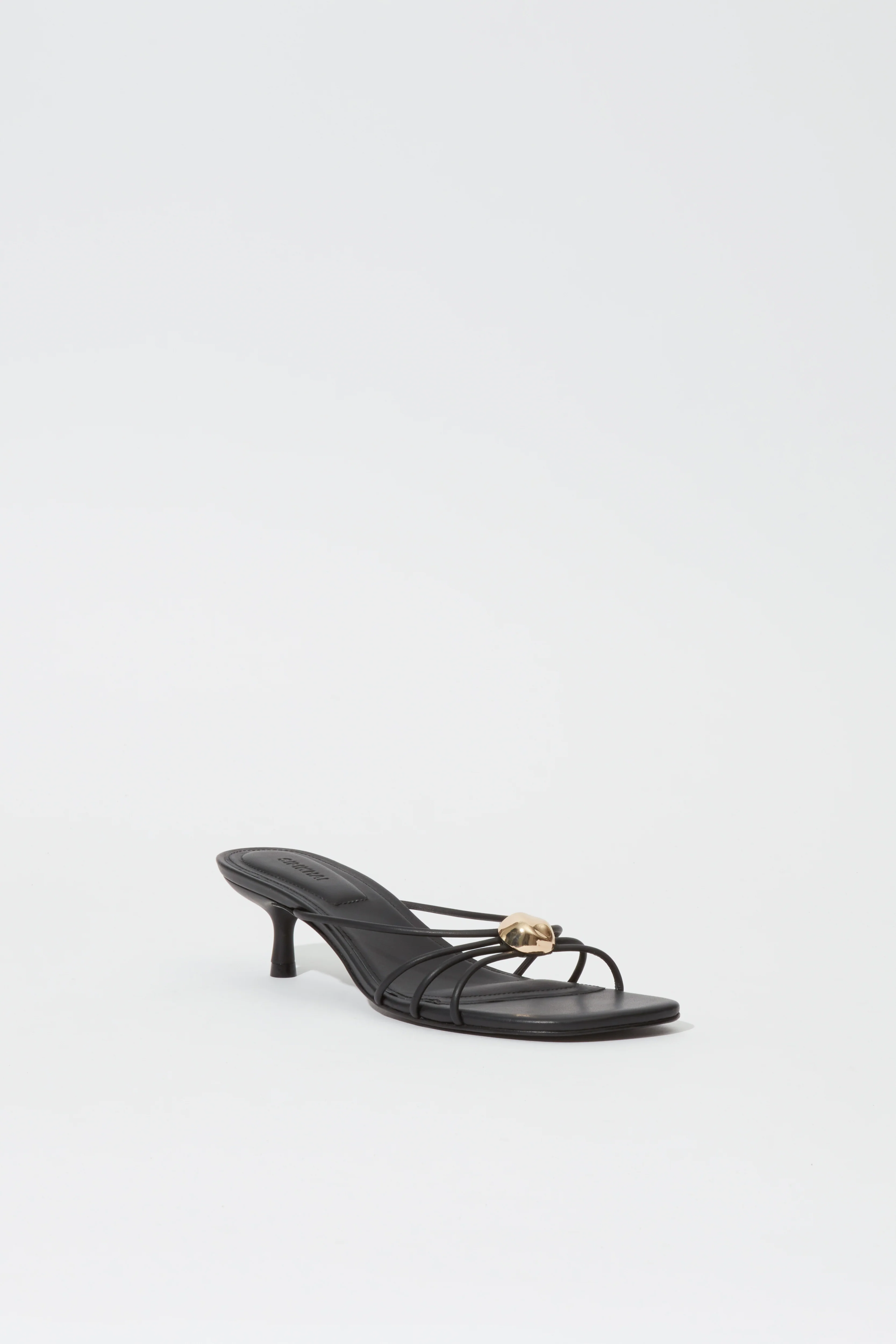 Delicate leather straps radiate from a polished golden button, creating a balanced interplay of structure and simplicity. Set on a slender heel with a squared toe, the silhouette feels both modern and timeless. Refined construction with a touch of allure.