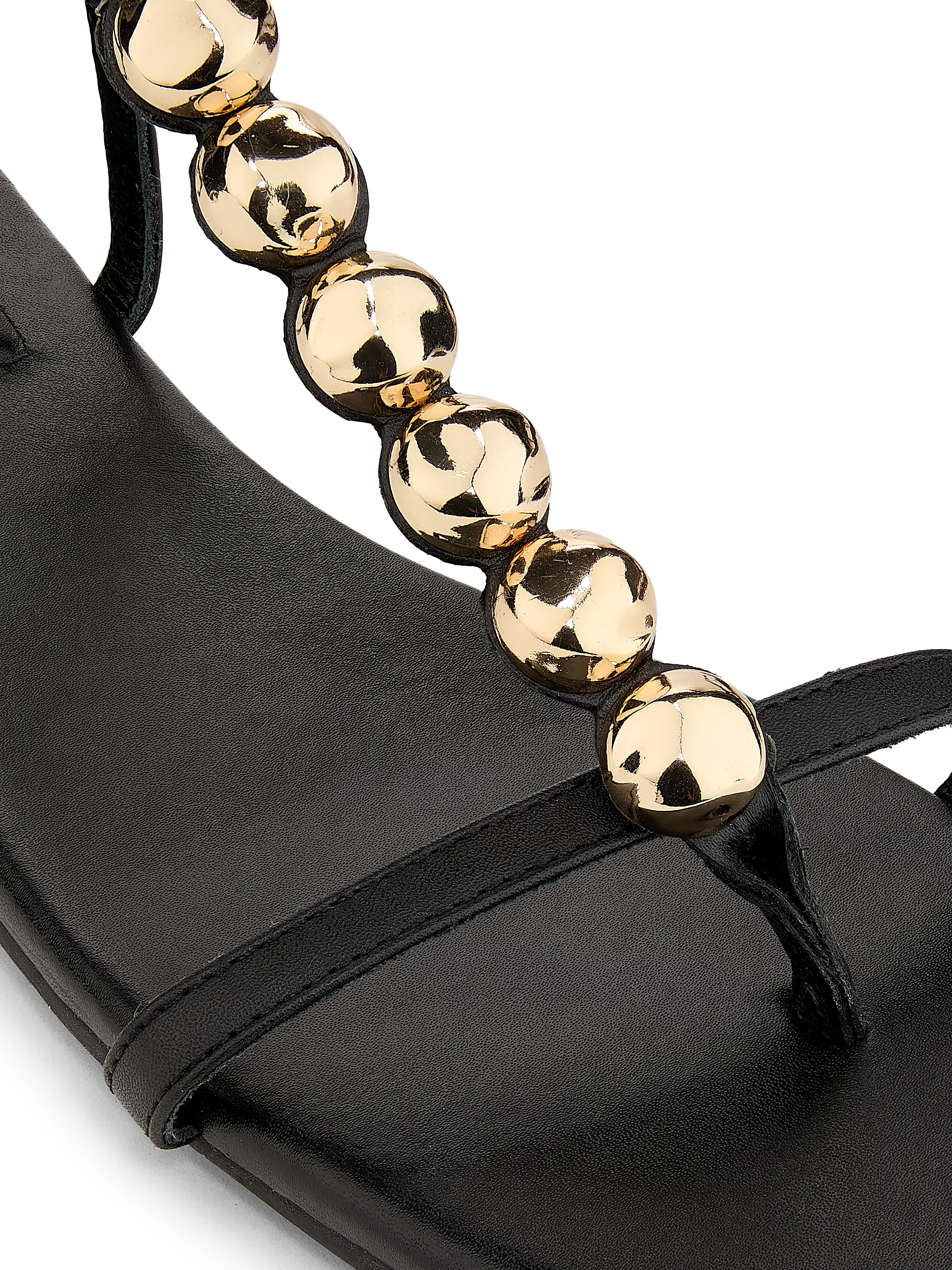 Domed goldtone studs lend shine to these strappy leather sandals. Open toe with a secure buckle closure.