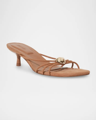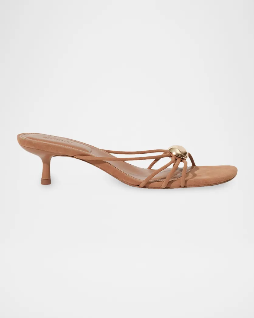 Delicate suede leather straps radiate from a polished golden button, creating a balanced interplay of structure and simplicity. Set on a slender heel with a squared toe, the silhouette feels both modern and timeless. Refined construction with a touch of allure.