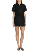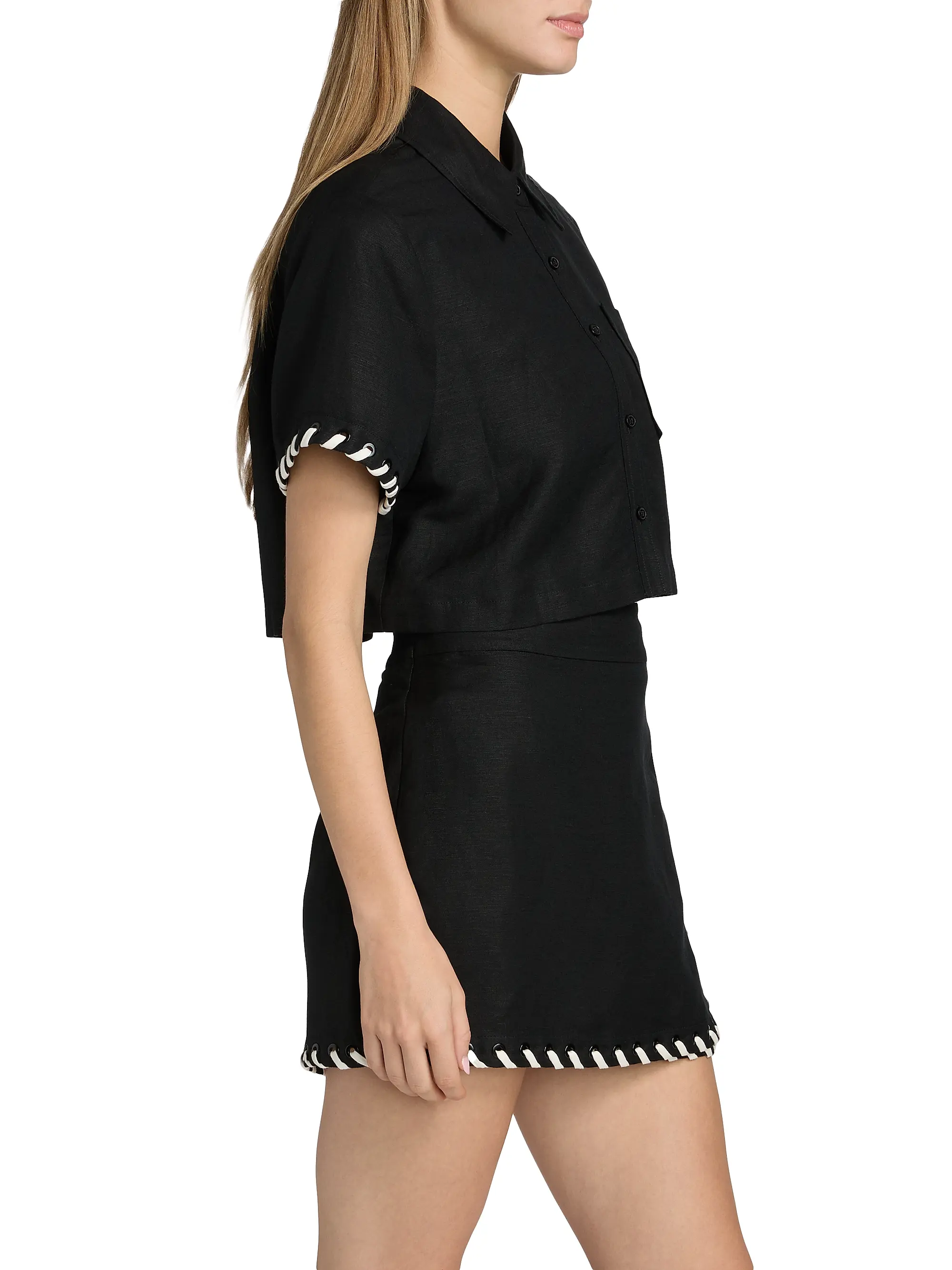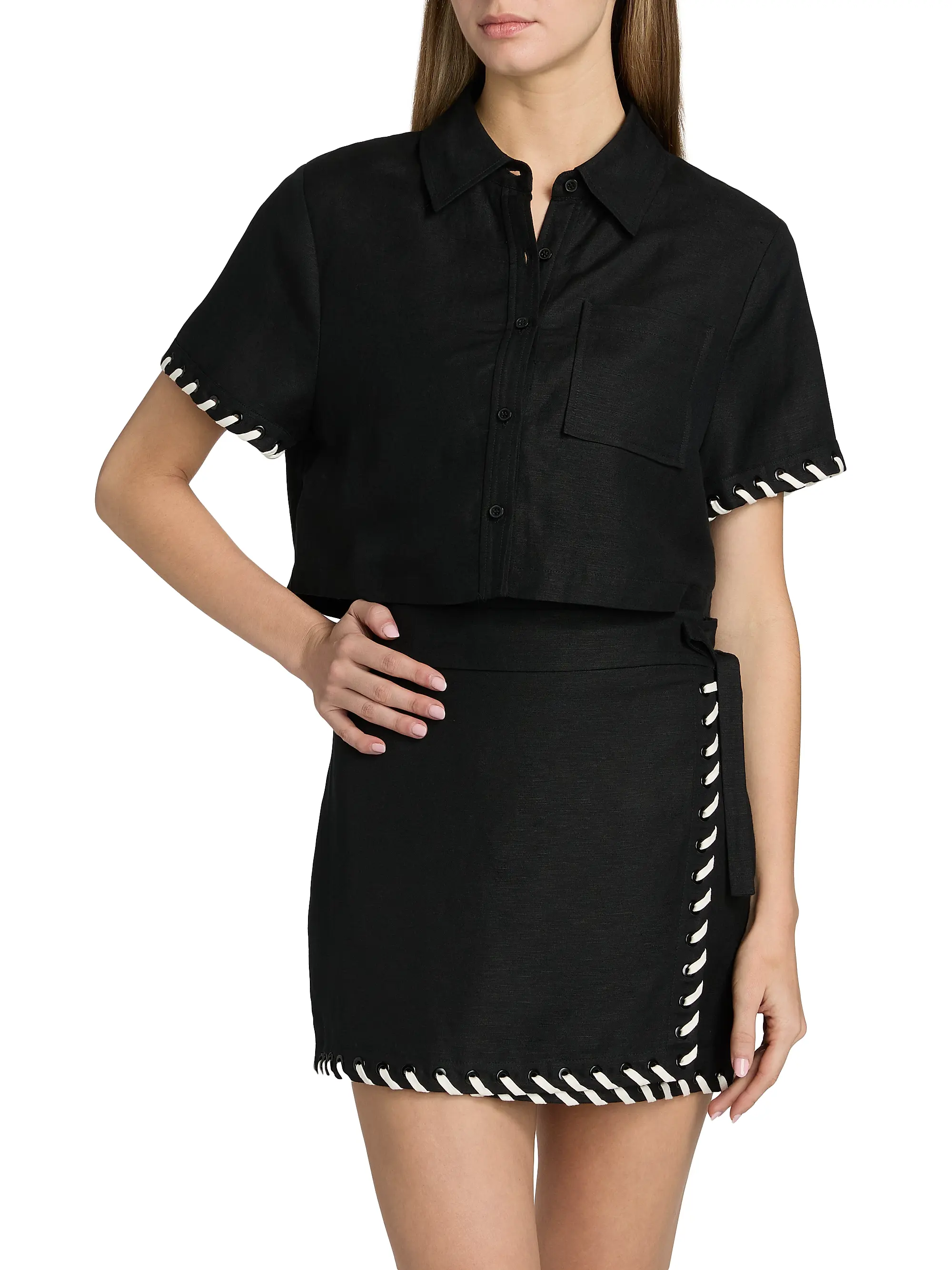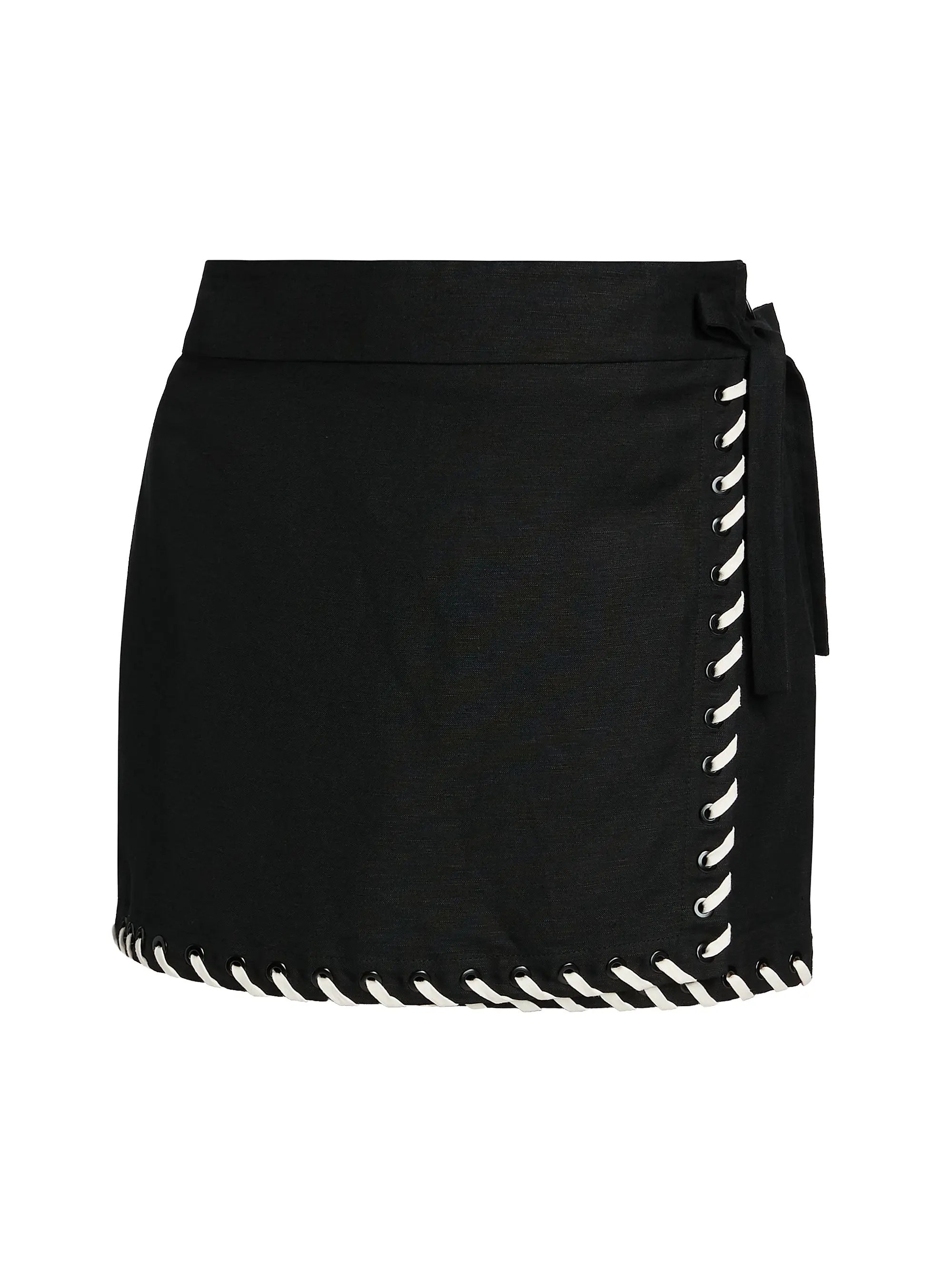 This wrap-style miniskirt is crafted of a luxe linen blend. Style with the Auggie Camp Shirt in Black Multi for a matching set.