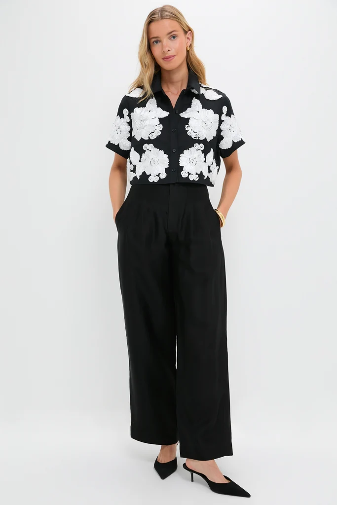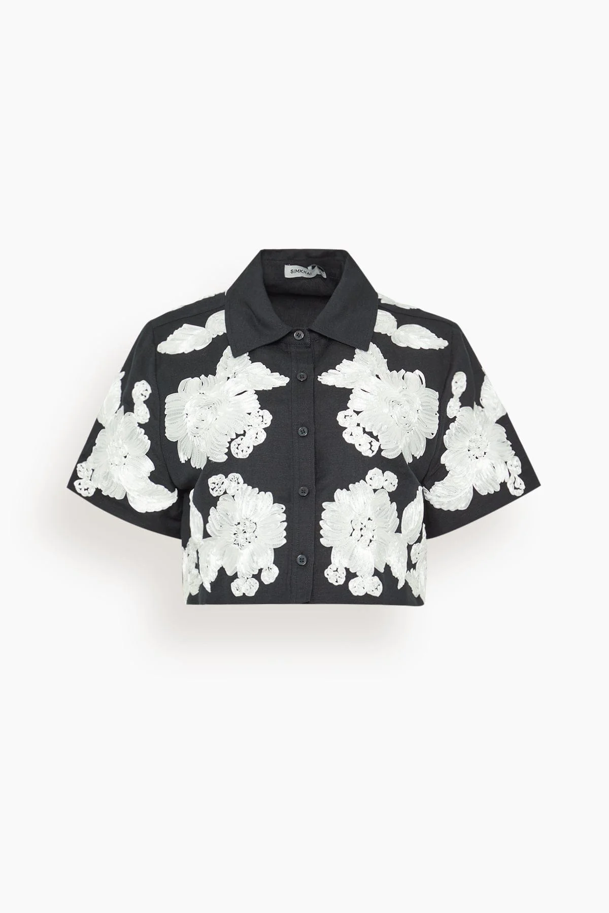 Constructed in a soft, breathable linen, this cropped button up features a relaxed silhouette with intricate contrasting floral embroidery.