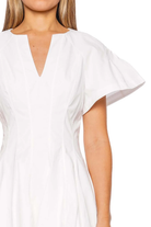 Crafted from premium cotton poplin fabric, this dress features an elegant A-line silhouette complemented by chic short flared sleeves.