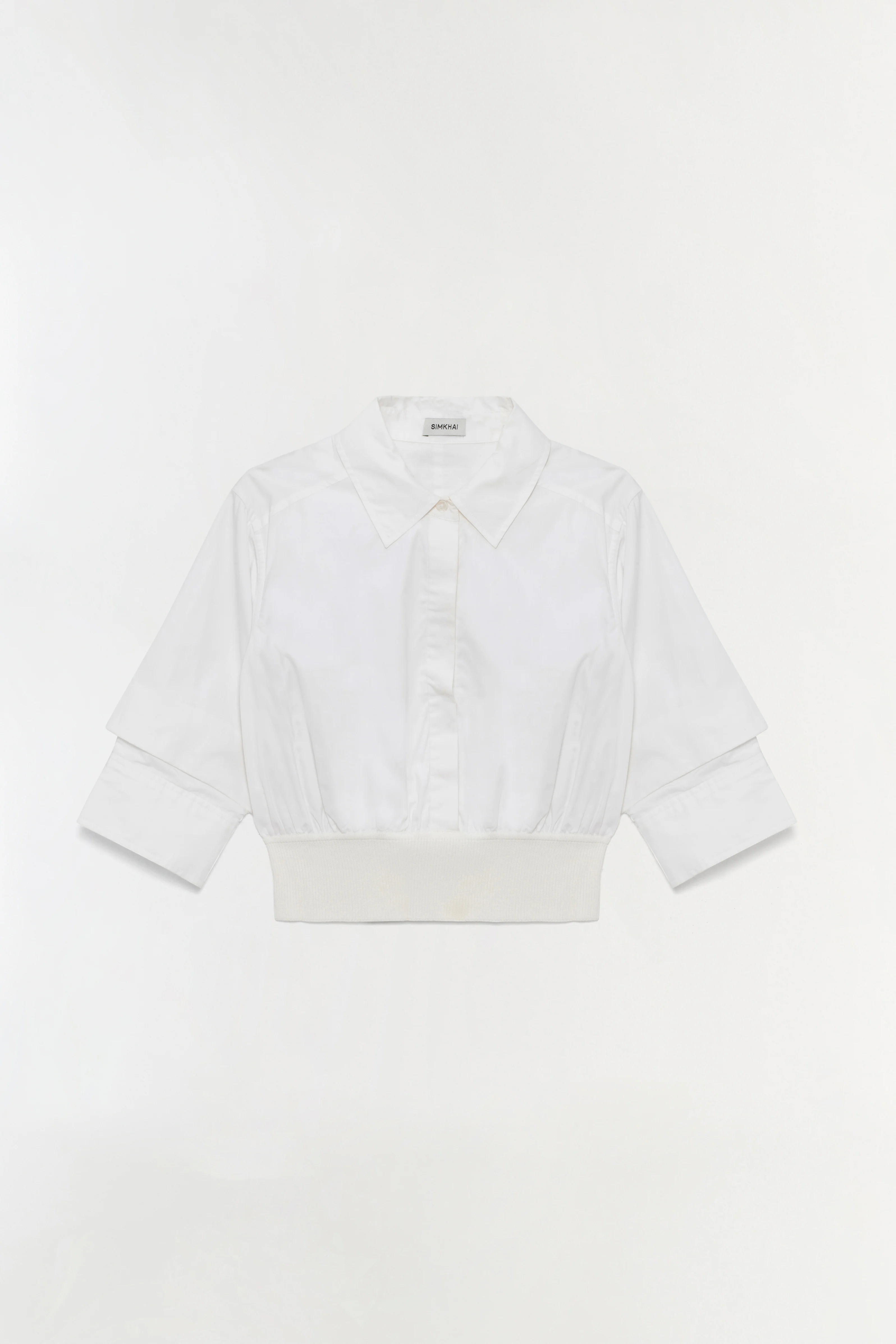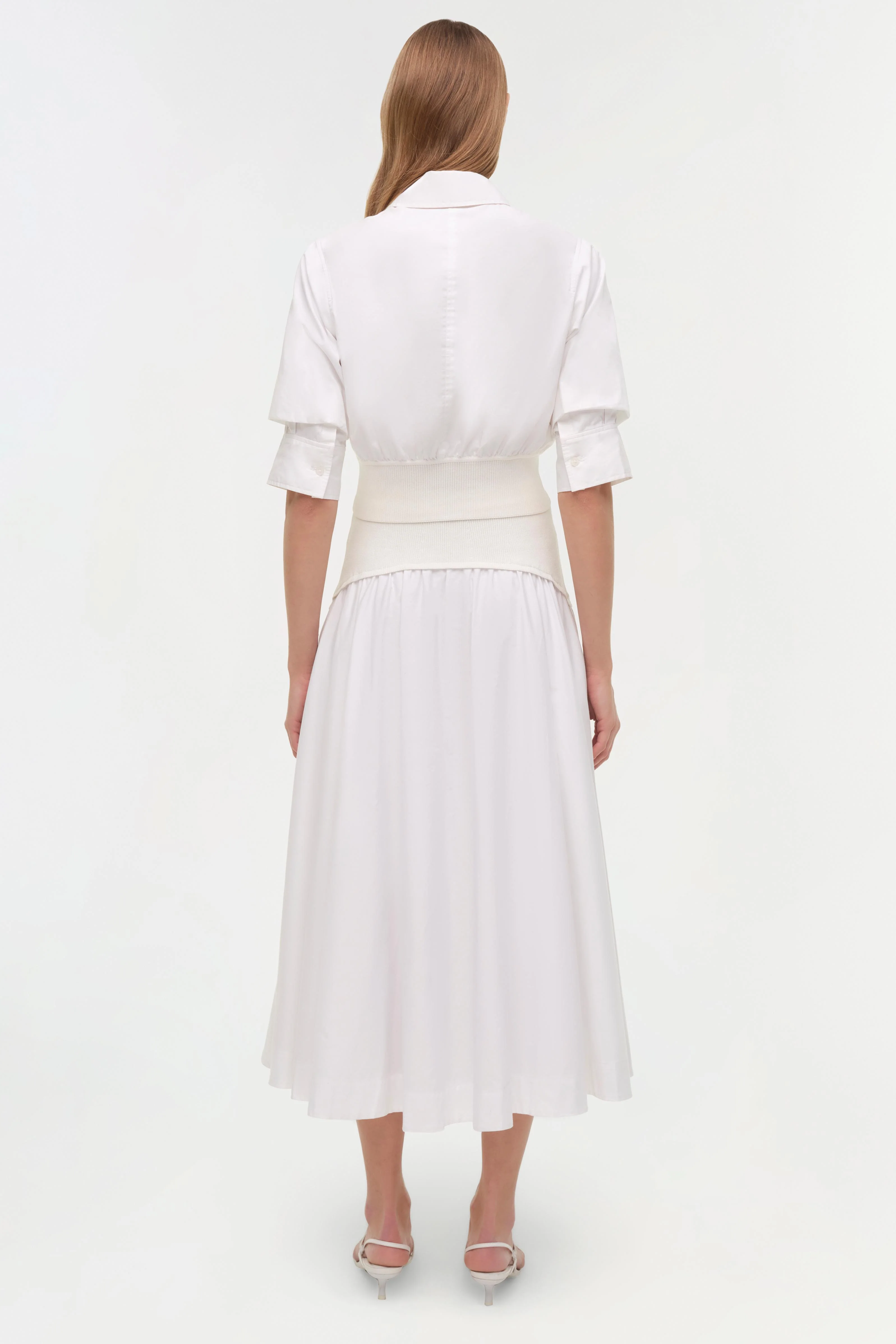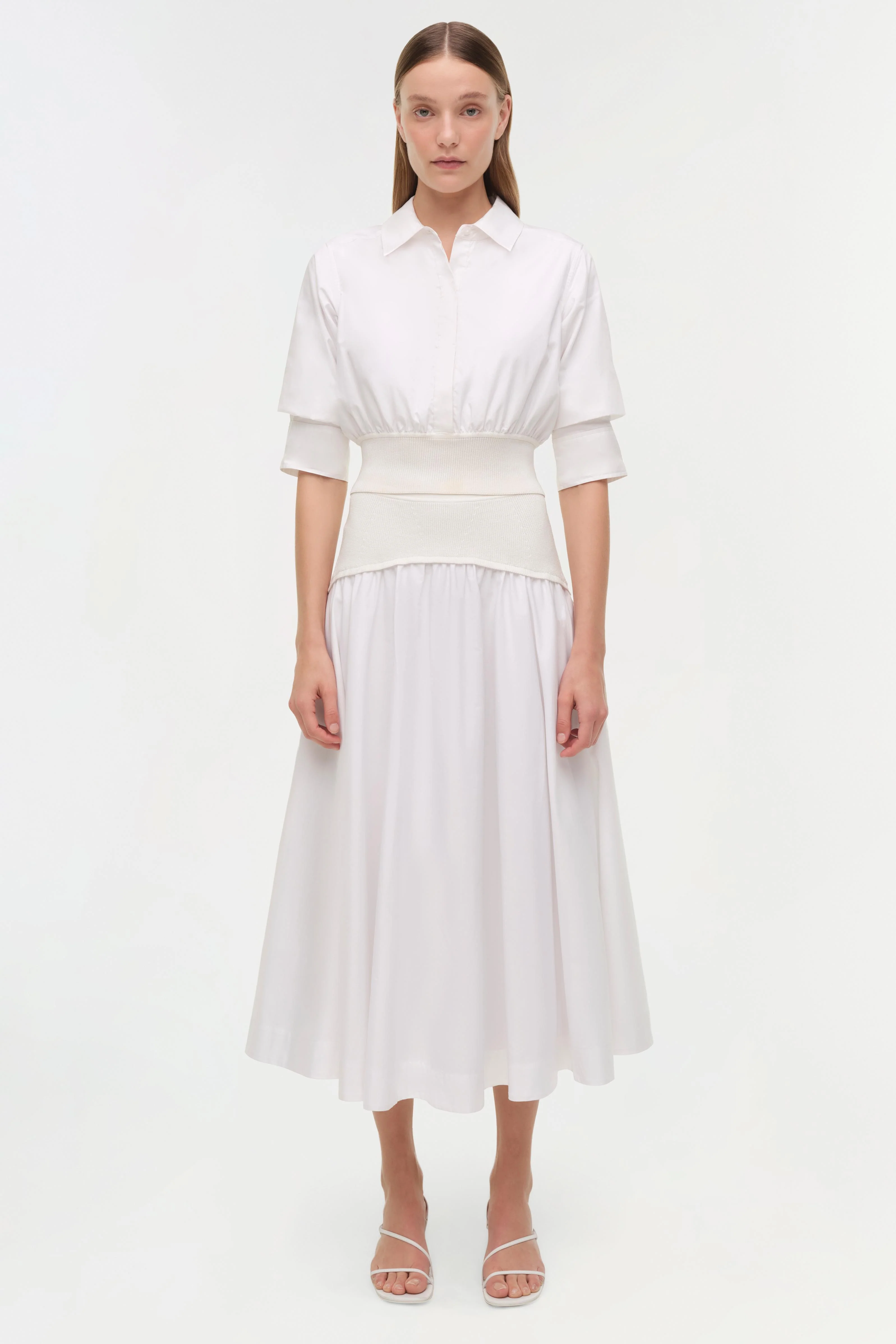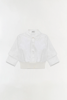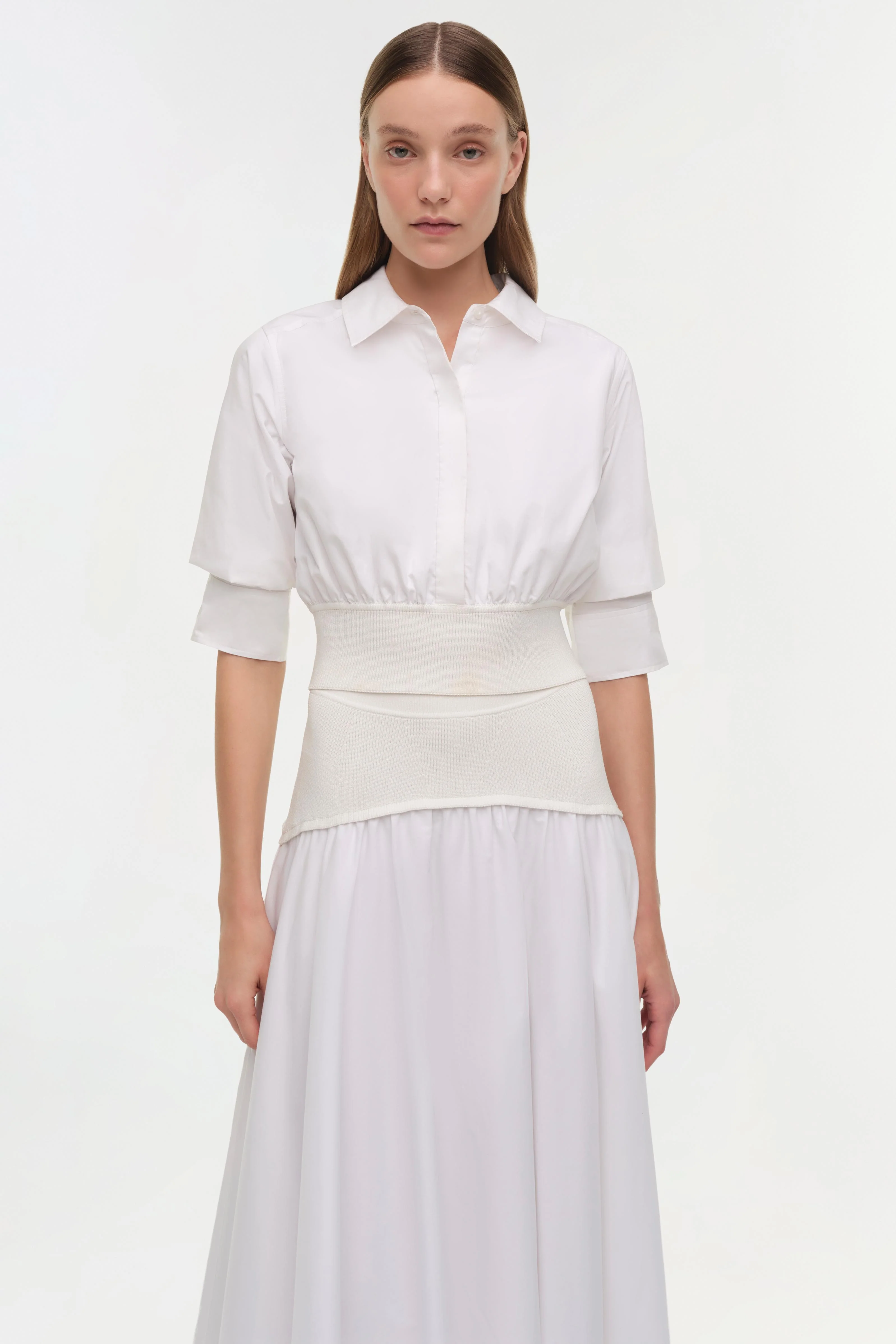 Made in smooth cotton poplin, this shirt top features a ribbed knit waistband that cinches the waist. The collared neckline and cropped proportion balance structure and ease. A modern take on classic shirting. Pair with the Ovie Knit Cotton Midi Skirt for a matching set.